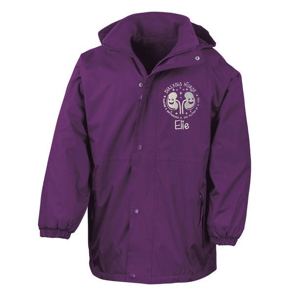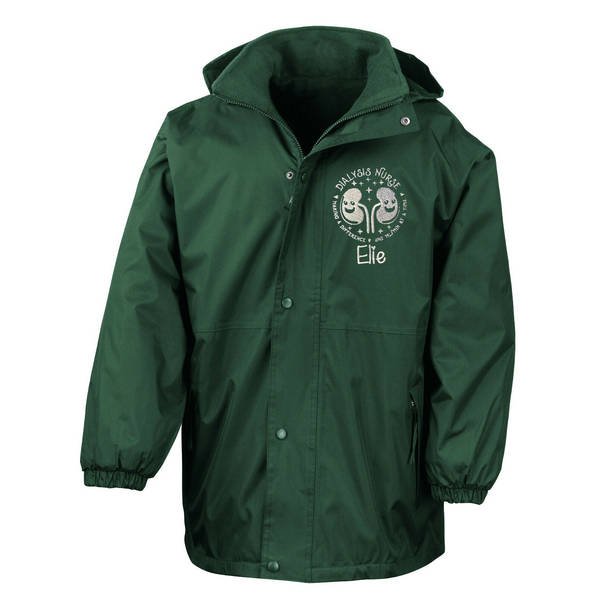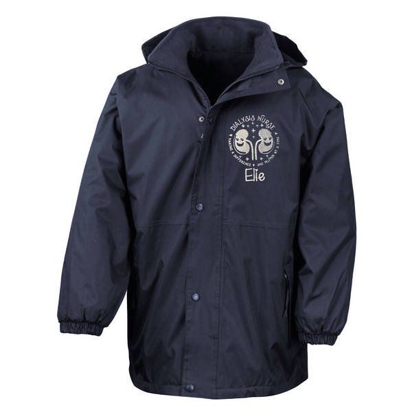 To order your personalised Healthcare Nursing Kidney Dialysis Design Waterproof Coat, please select your size and colour. Then use the text boxes provided to supply what you would like us to stitch on your soft shell.