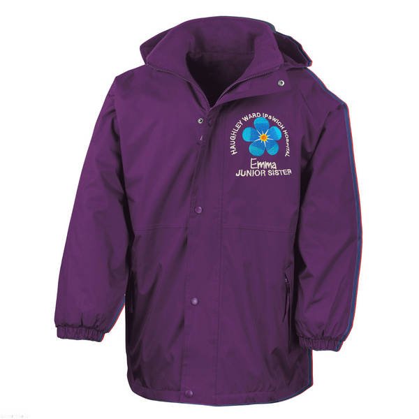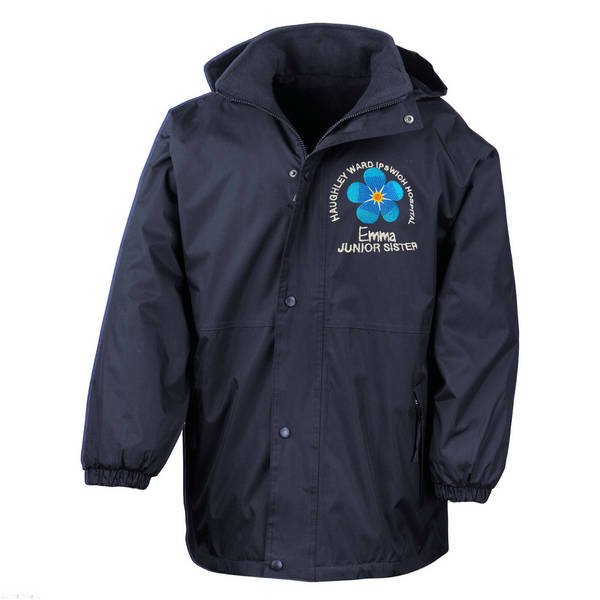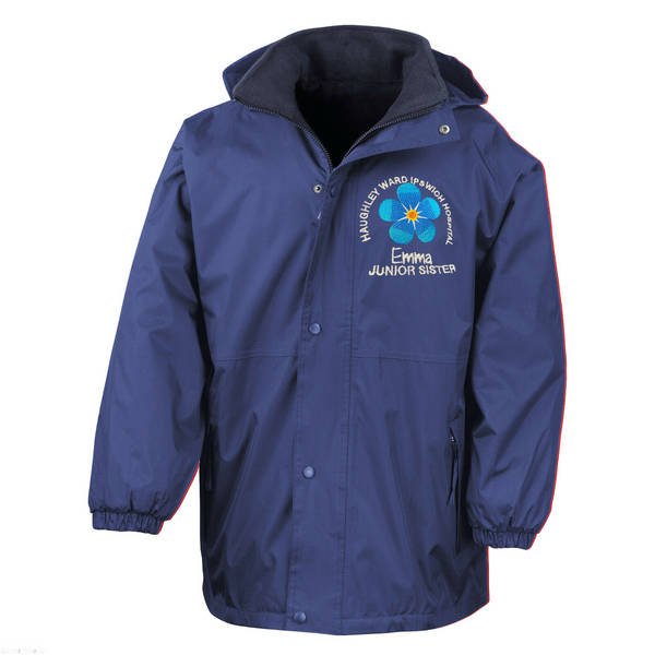 To order your personalised Healthcare Nursing Blue Forget Me Not Design Waterproof Coat, please select your size and colour. Then use the text boxes provided to supply what you would like us to stitch on your soft shell.