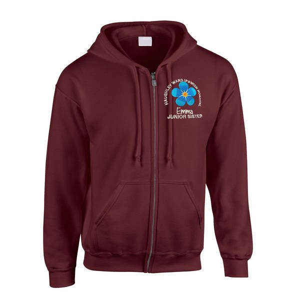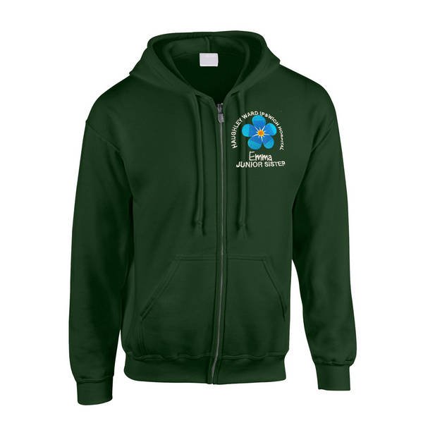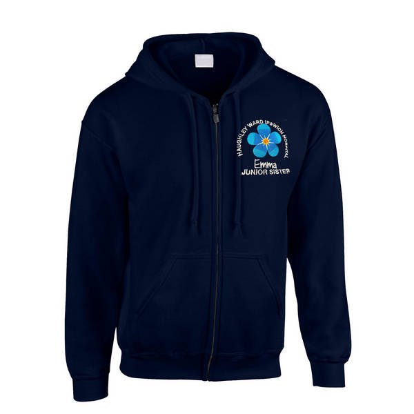 To order your personalised Healthcare Nursing Blue Forget Me Not Design Zipped Hoodie, please select your size and colour. Then use the text boxes provided to supply what you would like us to stitch on your zipped hoodie.