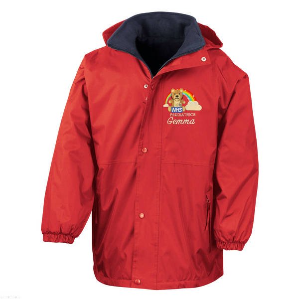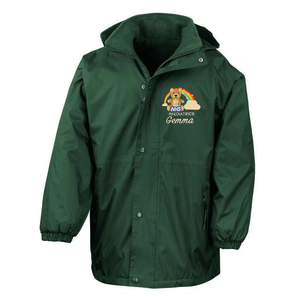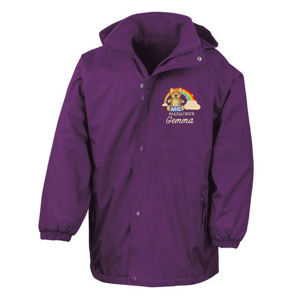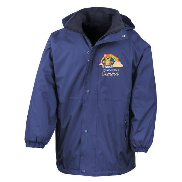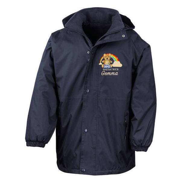 To order your personalised Healthcare Bear & Rainbow Stethoscope Waterproof Coat, please select your size and colour. Then use the text boxes provided to supply what you would like us to stitch on your soft shell.