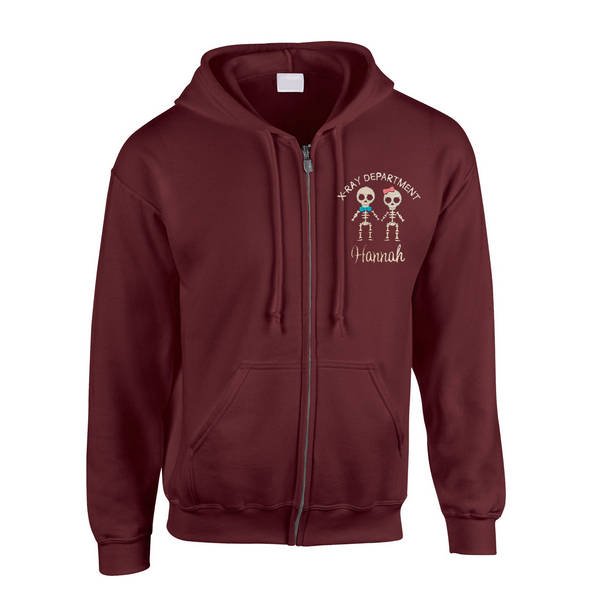 To order your personalised Healthcare Nursing X-Ray Skeletons Zipped Hoodie, please select your size and colour. Then use the text boxes provided to supply what you would like us to stitch on your zipped hoodie.